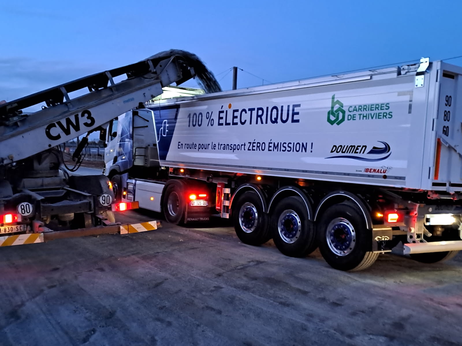 Depuis le début de l'année 2026, Carrières de Thiviers s'est engagé sur la chemin des véhicules électriques avec une première semi-remorque 100 % électrique et deux voitures de collaborateurs.